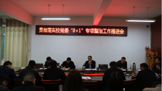 会议传达了校党委主题教育专项整治工作推进会精神,对我校的主题教育“8+1”专项整治工作项目实施方案进行了重点宣读,并对专项整治工作中接待、婚丧嫁娶问题,黄赌毒问题,不担当不作为方面进行专题分析。
