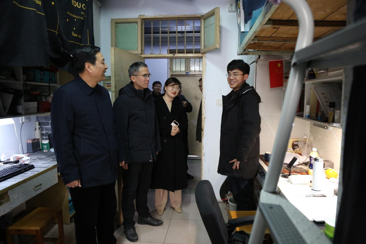 2月25日下午,党委副书记、工会主席董豪在学生处、后勤服务中心等相关部门负责人员陪同下,对学生公寓春季开学准备情况进行检查,并实地看望慰问返校学生。