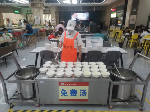 各餐厅延长冷气开放时间,灵活调整菜谱,以清淡、易消化的食物为主,注重营养合理搭配,并且安排专人向师生免费提供绿豆汤。