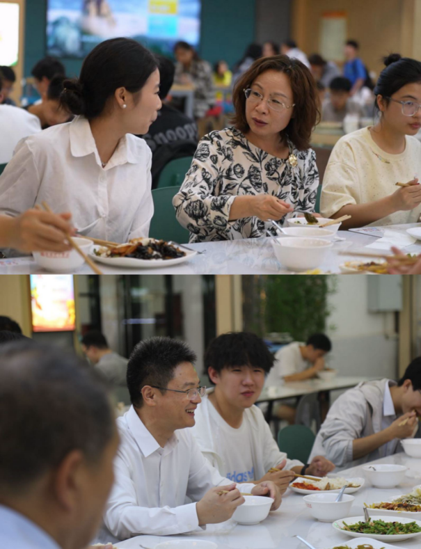 校领导们与同学们在餐桌旁比邻而坐,边用餐边畅聊。没有距离感,只有亲切感;没有程式化汇报,只有真切的交谈。饭菜的温度,瞬间拉近了心与心的距离。席间,校领导们关切地询问新生们入校以来的学习、生活适应情况,从课程设置、校园环境、食宿条件到社团活动、发展规划,话题广泛而深入。