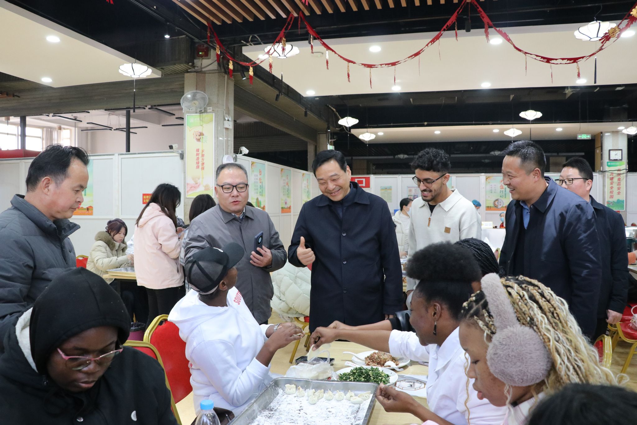 12月19日下午15时,在教工餐厅举行包饺子体验活动。校党委副书记董豪、后勤服务中心主任张良等领导亲临现场,与来自多个国家的留学生代表共同参与包饺子互动。活动中,校领导与留学生亲切交流,细致询问他们的学习生活情况,并亲手示范擀皮、包馅等传统技艺。留学生们在面点师傅的指导下踊跃尝试,体验中华饮食文化的独特魅力。现场欢声笑语不断,展现了跨文化共融的友好氛围。