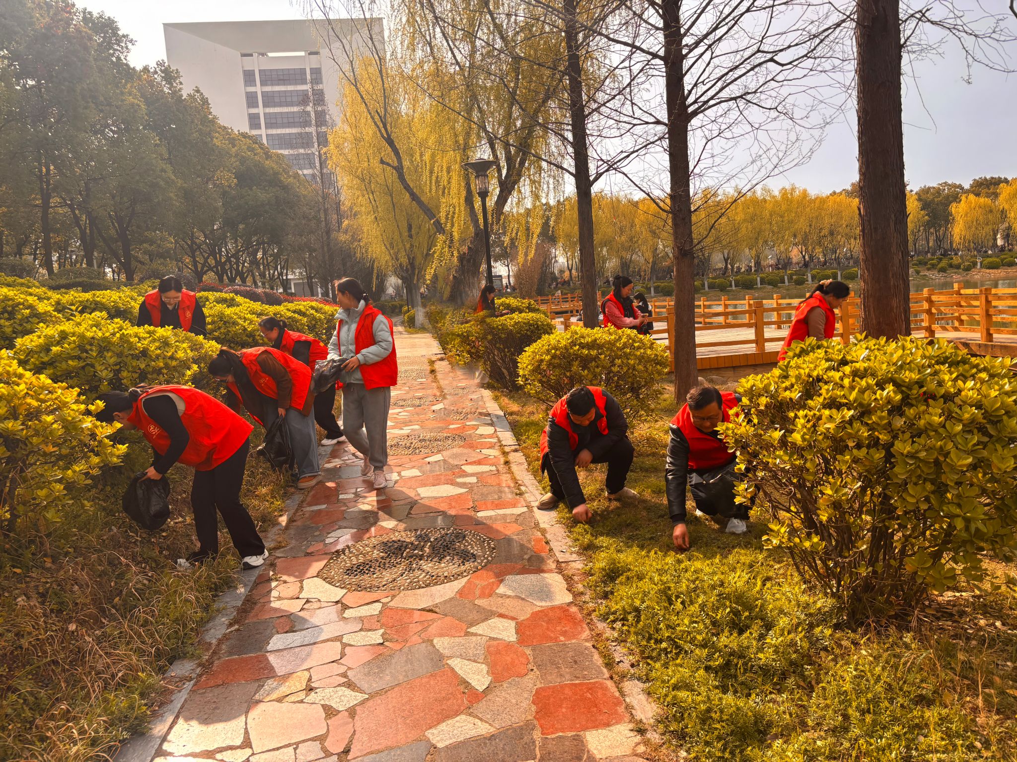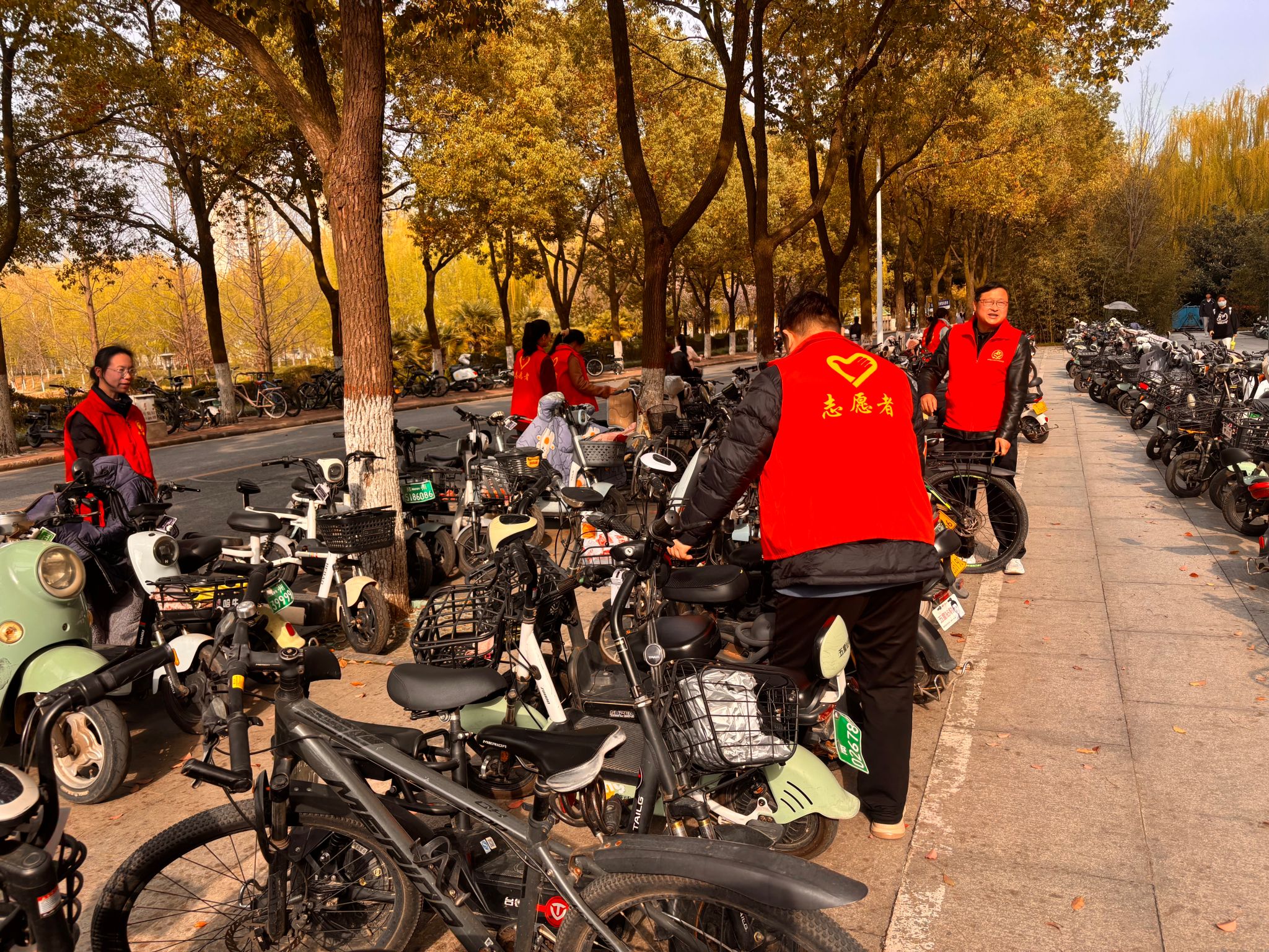 活动现场,志愿者们身着红马甲、手持垃圾袋,化身校园 “美容师”与“秩序维护员”。在梦溪湖周边,大家分工协作、默契配合,弯腰俯身捡拾杂物垃圾,细致清理隐蔽角落的卫生死角,让湖边沿岸重现整洁清爽;在图书馆前广场,针对车辆停放杂乱问题,志愿者们逐一整理摆放不规范的车辆,统一调整朝向、梳理通行通道,让广场秩序焕然一新。志愿者们不怕脏、不怕苦、不怕累的精神风貌,成为校园里一道亮眼的风景线。