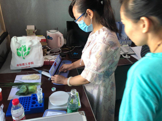 张留哲就我校的食品安全工作与南召宾馆的负责人进行了交流,充分了解当地的情况后,臧书峰根据南召宾馆的实际情况,对南召宾馆的米、面进行了黄曲霉毒素、呕吐毒素检测;对蔬菜进行了农残检测;对辣椒、八角等调味料进行了二氧化硫检测。