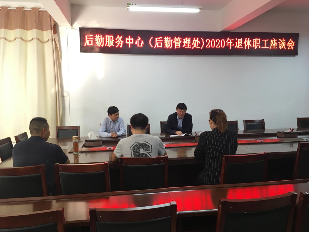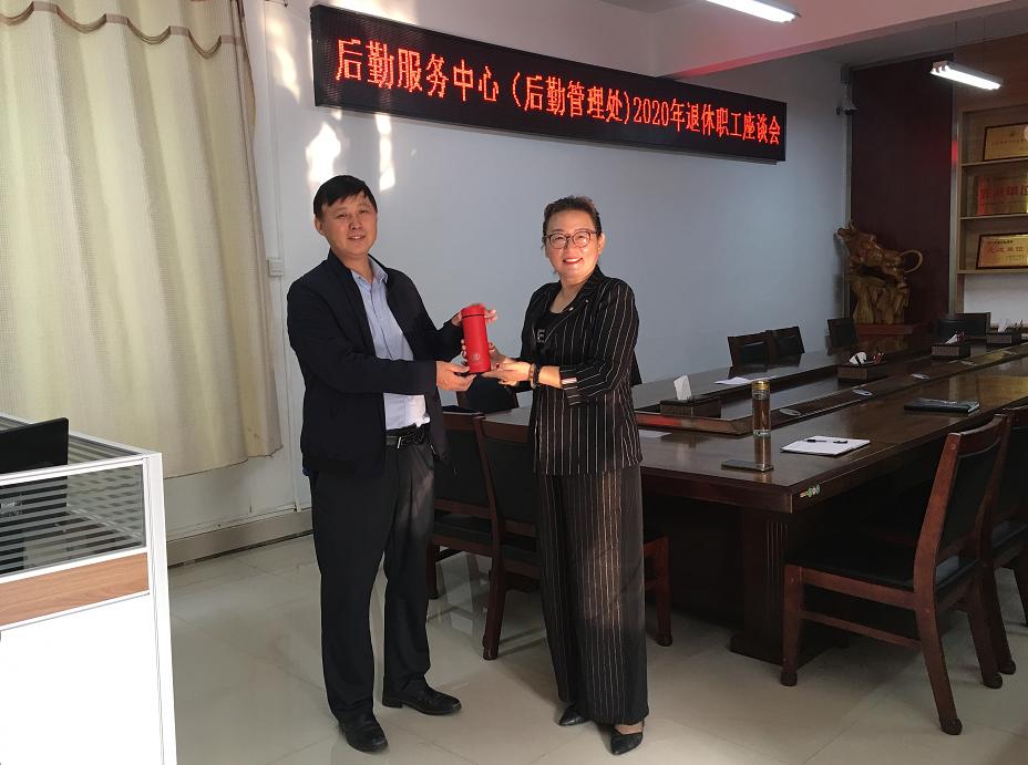 9月30日上午,后勤中心在会议室召开2020年退休职工座谈会,欢送吴雅柯同志光荣退休。主任(处长)熊新忠、副主任(副处长)王海、党政办公室主任杜银存、人力资源科科长李大志参加了此次座谈会。