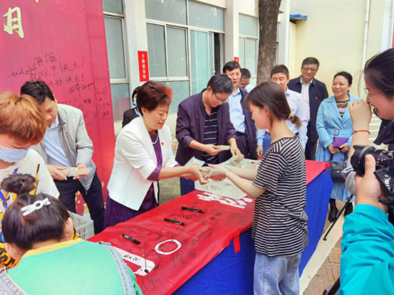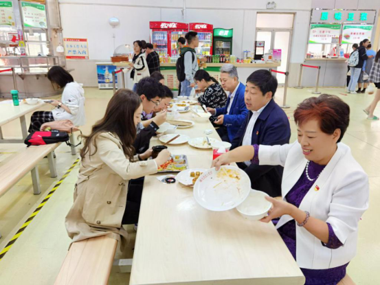 仪式结束后,到场领导及学生代表纷纷到签名墙签下姓名,以此响应“节约粮食,杜绝浪费”主题活动。刘荣英一行来到学苑餐厅广场为同学们发放中秋节学校定制款月饼,并进入食堂检查查看学生餐厅、教工餐厅“节约粮食杜绝浪费”相关制度及措施落实情况和宣传氛围营造工作,随后在学生餐厅和学生一起共进午餐,了解学生在校生活,亲身带领学生响应光盘行动。(供稿/贾小真 编审/尤龙飞)