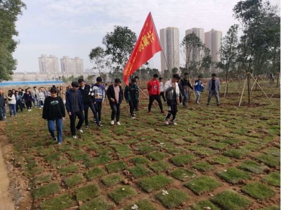 根据活动安排,同学们准时到达120亩新征地后,在绿化环卫科工人的指导和协助下进行分工,有的捡拾地上的石子,有的切分、铺设草皮,有的踩实草坪,显示出了饱满的工作热情和积极状态。在大家的合作下,草坪很快就铺设完成变得整洁起来。
