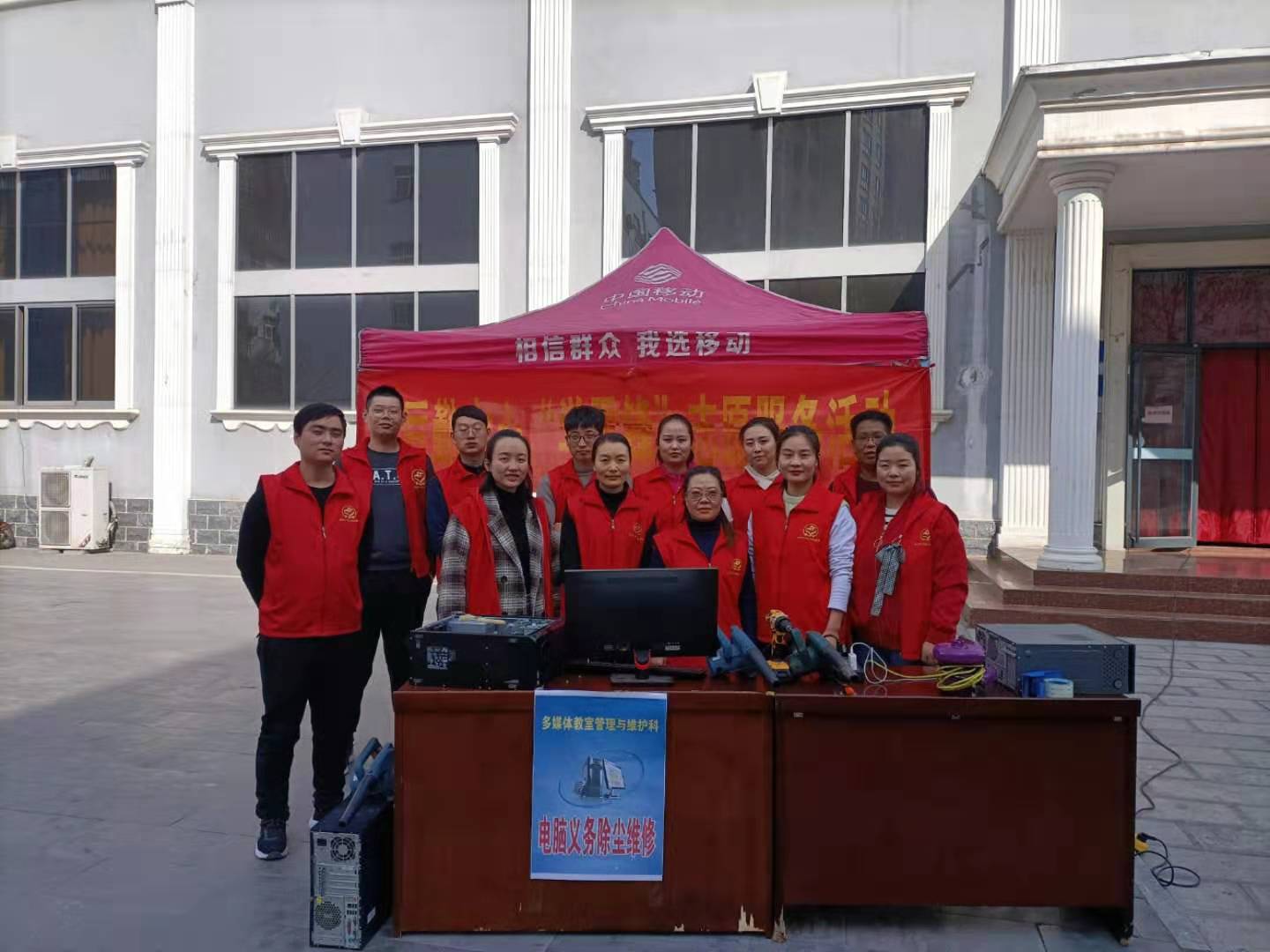 2021年3月24日下午,多媒体教室管理与维护科在毕业大厅西门前开展了“电脑义务维修除尘志愿服务活动。