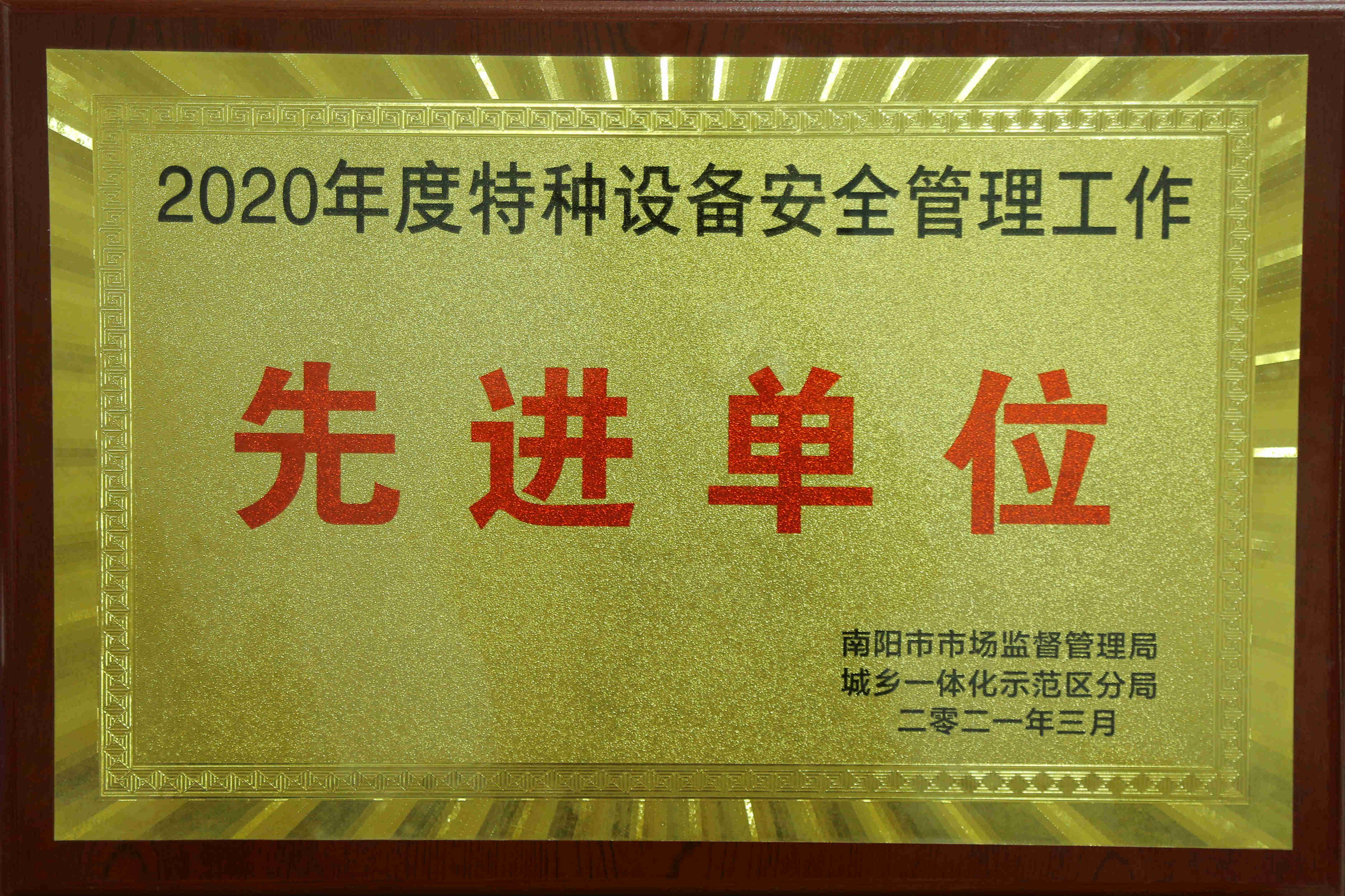 近日,我校荣获南阳市市场监管局城乡一体化示范区分局“2020年度特种设备安全管理工作先进单位”称号。文书德同志被授予示范区2020年度特种设备安全管理“先进个人”荣誉称号。