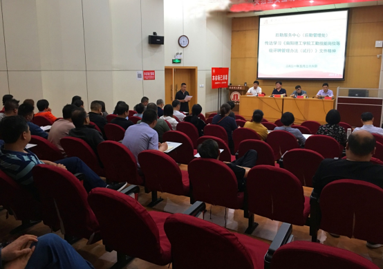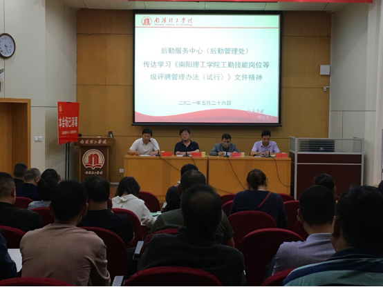 为顺利开展工勤技能岗位等级评聘工作,5月26日下午,后勤中心在中込会馆报告厅召开会议,传达学习《南阳理工学院工勤技能岗位等级评聘管理办法(试行)》(南理工字〔2021〕77 号)文件精神。后勤中心领导班子成员及全体后勤教职工参加会议,会议由中心副主任王海主持。