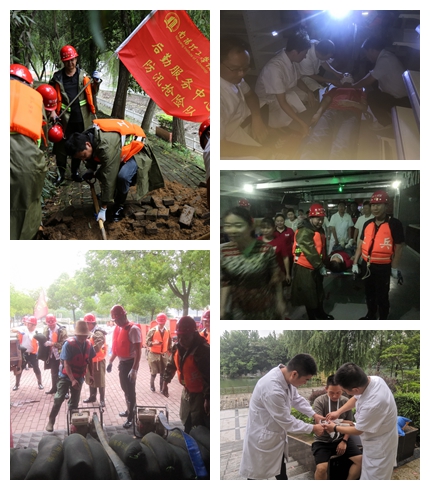 演练开始后,各小分队各司其职,因强降雨造成校体育馆周围路面水位达到50公分,急需挖沟将水排到溧河河道内;雨水已漫过东南校区地下超市进口拦水坝,拦水坝急需加固加高,地下超市人员已有人员受伤,需要立即疏散,进水需要排出。党员抢险队在队长王海带领下,迅速赶往东南校区地下超市进口处处置险情,疏散地下超市人员,排出地下超市进水,救助伤员。防汛抢险一队在队长尤龙飞带领下,携带铁锹等工具迅速赶往校体育馆,开挖导水沟,处置险情。后勤保障队队长仝允波迅速组织车辆向东南校区地下超市进口处运送沙袋、抽水机,同时组织挖掘车辆赶到现场作业。防汛抢险二队在队长仝允波带领下,驾驶救援船营救在梦溪湖小岛上围困的学生。医疗救护队队长郜中明带领三组救护队成员分赴三个演练现场实施伤员救助。保卫处组织三组人员分赴演练现场组织秩序维护。经过30分钟的艰苦奋战,顺利完成抢险任务,确保了师生的生命财产安全。