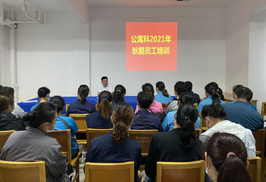 为进一步加强公寓疫情防控与日常管理,提高学生公寓的服务水平,营造安全和谐的宿舍环境,8月31日--9月1日,后勤服务中心公寓科在19#学生公寓一楼会议室开展2021年秋期员工培训,全科50余人参加培训。