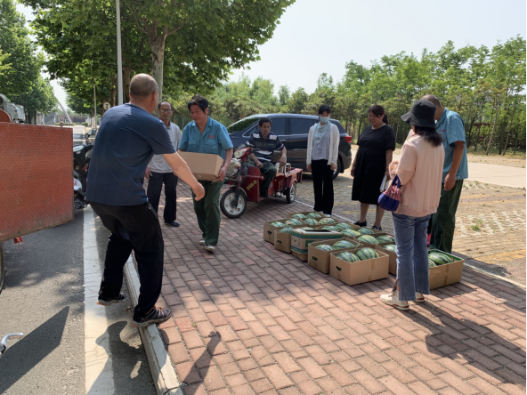 此次爱心慰问,天猫校园店筹措资金9000余元,采购新鲜西瓜四千余斤,为奋战在后勤保障一线的人员发放西瓜降暑品。