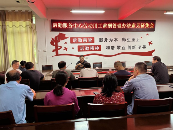 7月28日上午,后勤服务中心在第一会议室召开劳动用工薪酬管理办法意见征集会。后勤服务中心主任闫合占、副主任尤龙飞及科级干部、业务主管、技术岗人员、坐班人员和服务岗人员代表参加会议。会议由人力资源科科长鲁红卫主持。