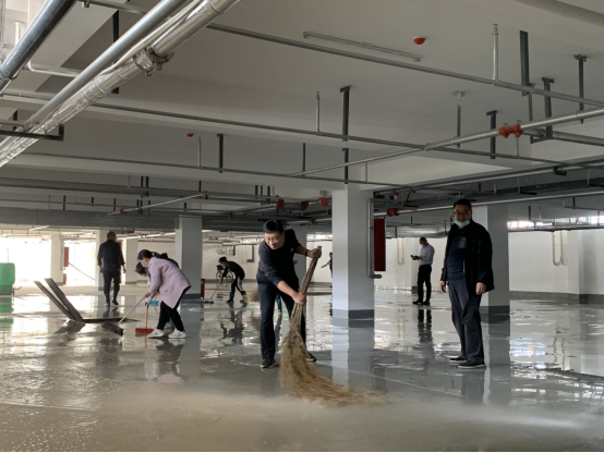 因22-25#学生公寓地下室未投入使用,地面泥土、灰尘较多,清洁面积较大,公寓科集中组织人员对地下室整体环境进行深度清洁,对卫生死角进行整治。同时,为确保地下室消防安全,公寓科排查试用了消防栓及消防水带等消防设施,秉承“勤俭节约 杜绝浪费”原则,利用排查试用水量冲洗地面。