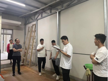 大家冒着酷暑,对建筑学院7号楼文化墙、广场铺装改造、青年公寓校医院木地板改造、2号楼配电室升级扩容改造、料场改造、东校区餐厅食材验收管理室、开水房改造等项目进行现场勘察,对工程质量、观感进行检查,对照工程量清单数据查验是否相符。