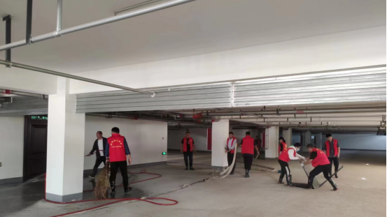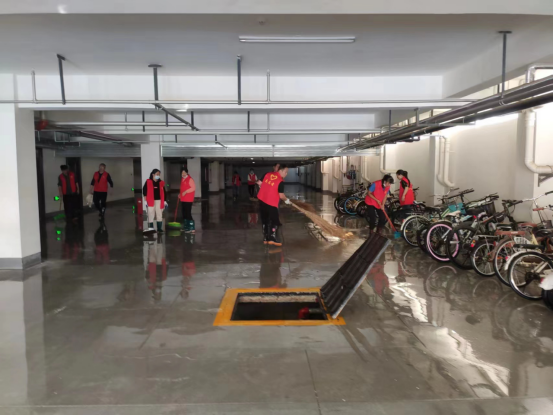 因22-25#学生公寓地下室未投入使用,地面泥土、灰尘较多,清洁面积较大,公寓科集中组织人员将地下室乱停乱放的电动车摆放整齐,对整体环境进行深度清洁,对卫生死角进行整治。同时,为确保地下室消防安全,公寓科排查试用了消防栓及消防水带等消防设施,秉承“勤俭节约 杜绝浪费”原则,利用排查试用水量冲洗地面。
