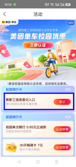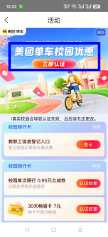 (二)学生:下载并注册美团APP完成实名认证,进入【首页】点击【骑车】按钮,滑动条目至最右侧点击【校园优惠】(蓝框)进入“活动”页面;点击【立即认证】,根据系统提示点选“地区”、“城市”、“学校”、“学历”、“入学年份”、“毕业年份”等信息后点击【提交】,认证成功后即可购买活动页面相应的优惠骑行卡。(年龄在16-26岁的学生在校园内操作一般可立即通过认证;不符合条件的需美团APP后台在3个工作日进行人工审核)